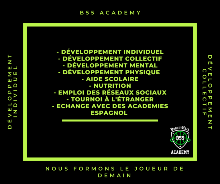 Durant toute l’année scolaire, la B55 Academy accueille les joueur(euse)s U10 (2012-2013) U12 (2012-2011), U14 (2010-2009), U15 (2008) au sein de l’académie (maximum 12 enfants par catégories)