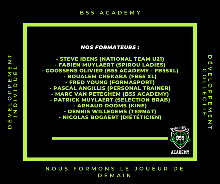 •  Une formation et un encadrement de qualité avec Steve Ibens (Directeur Technique) et Olivier GOOSSENS (CEO) permettront de favoriser l’éveil et l’épanouissement des joueurs. La B55 Academy s’appuie sur ses valeurs de solidarité, partage, éthique de travail, respect et engagement