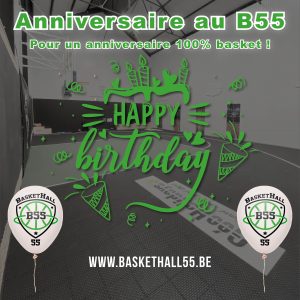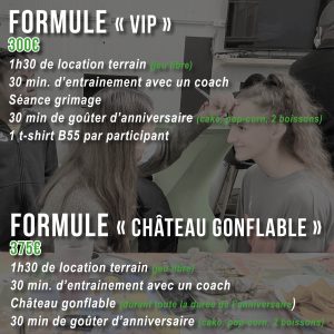 1h30 de location terrain (jeu libre) ; 30 min. d’entrainement avec un coach ; séance grimage ; 30 min de goûter d’anniversaire (cake, pop-corn, 2 boissons) ; 1 t-shirt B55 par participant