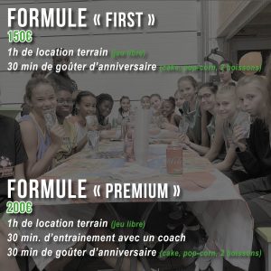 1h de location terrain (jeu libre) ; 30 min. d’entrainement avec un coach ; 30 min de goûter d’anniversaire (cake, pop-corn, 2 boissons)